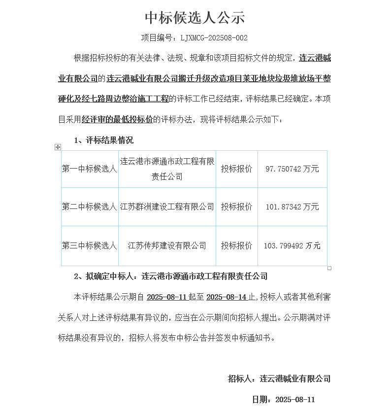 搬迁升级改造项目莱亚地块垃圾堆放场平整硬化及经七路周边整治施工工程中标候选人公示