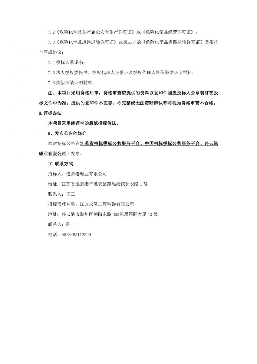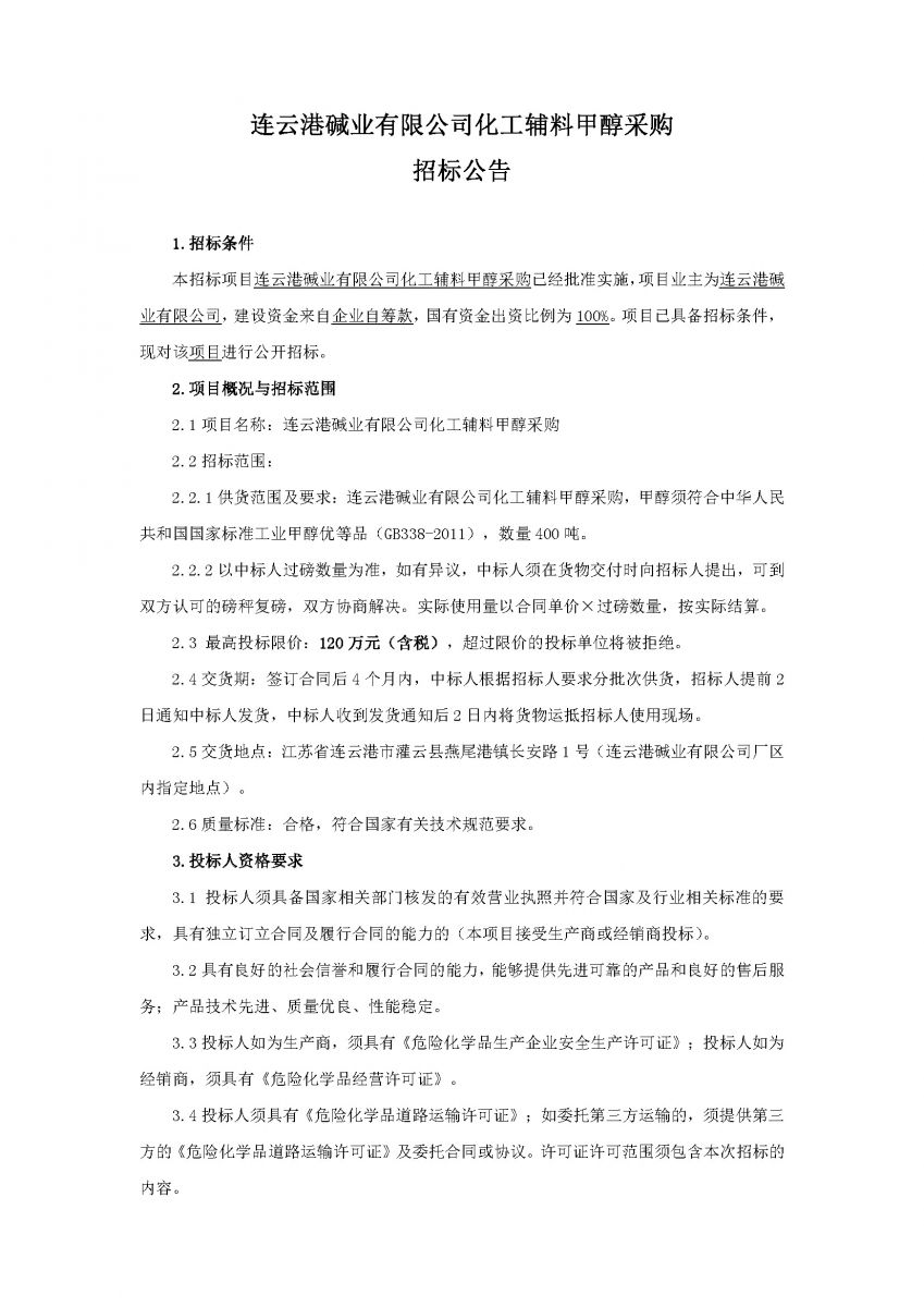 连云港碱业有限公司化工辅料甲醇采购招标公告