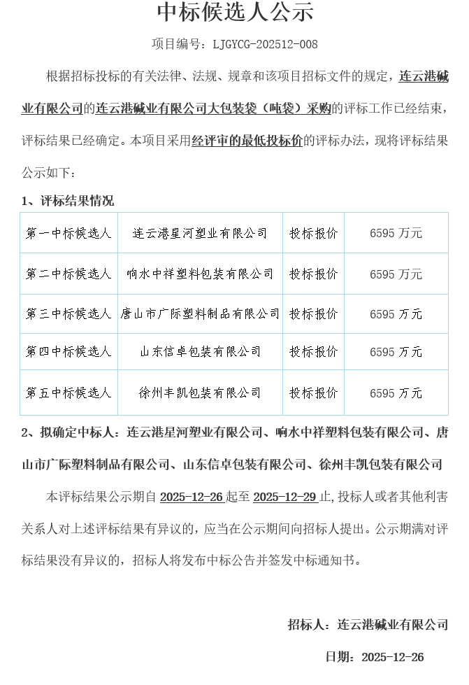 连云港碱业有限公司的连云港碱业有限公司大包装袋(吨袋)采购中标候选人公示