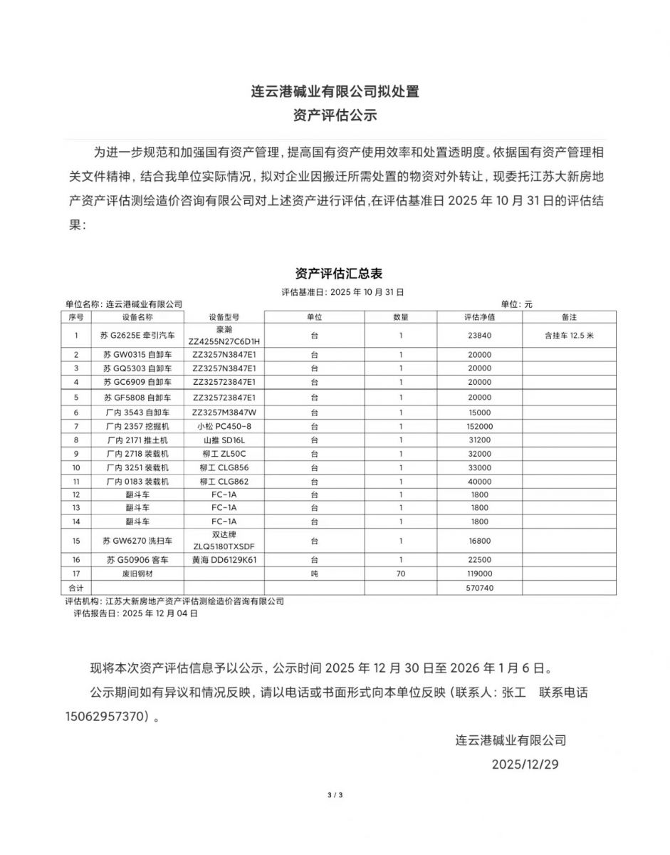 连云港碱业有限公司废旧车辆、钢材资产评估公示